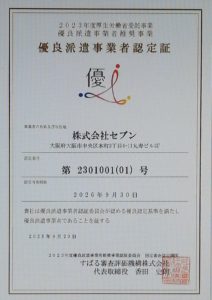 『優良派遣事業者 第2301001号』として認定され、取得いたしました!!