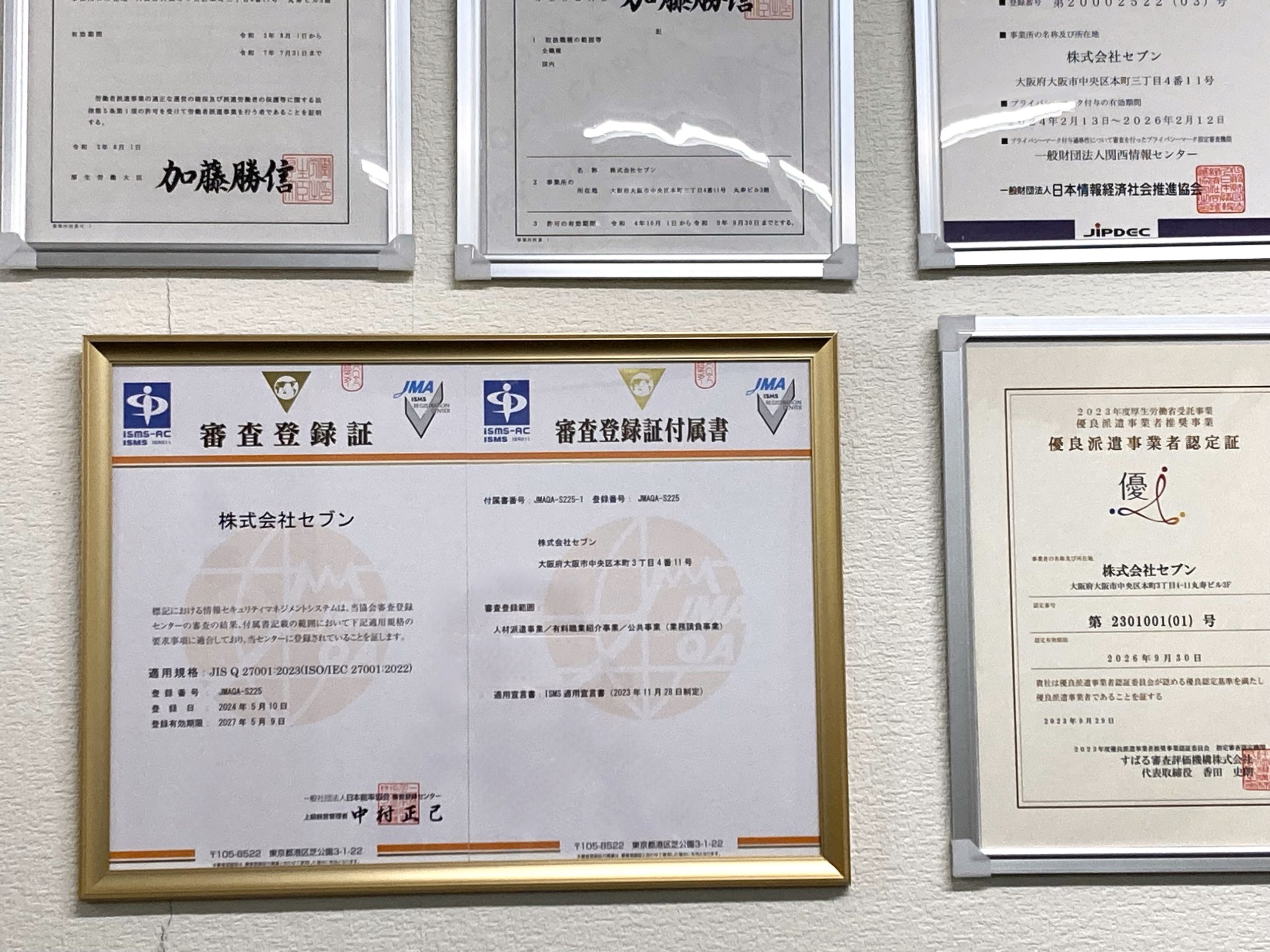 下記の写真は、本社に掲示されている様々な資格証・認定証の一部です。